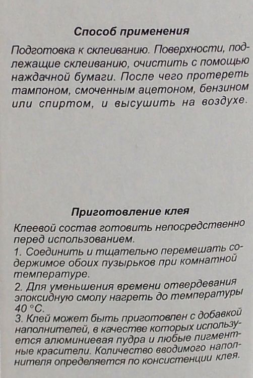 Комплект поставки: основа в полиэтиленовой бутылке - эпоксидная смола модифицированная и стеклянный (полиэтиленовый) флакон с отвердителем.