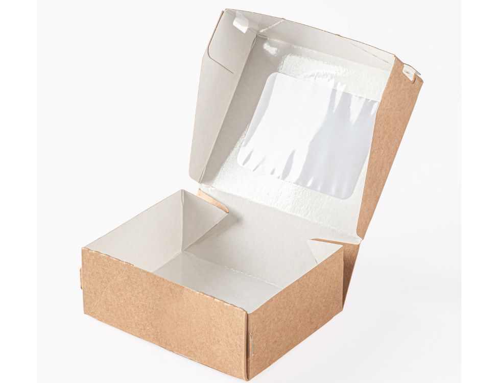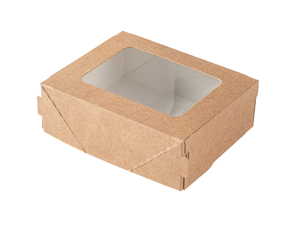 Коробка самосборная из крафт картона ламинированного с прозрачным окном из толстой ПВХ пленки.