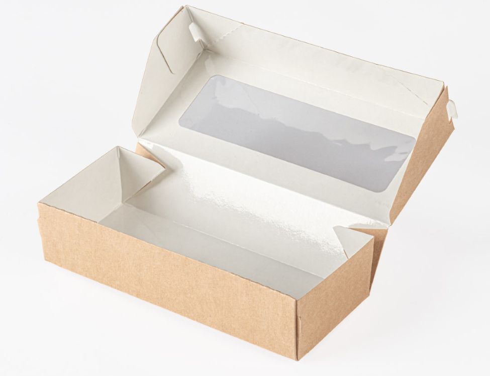Коробка самосборная из крафт картона ламинированного с прозрачным окном из толстой ПВХ пленки.