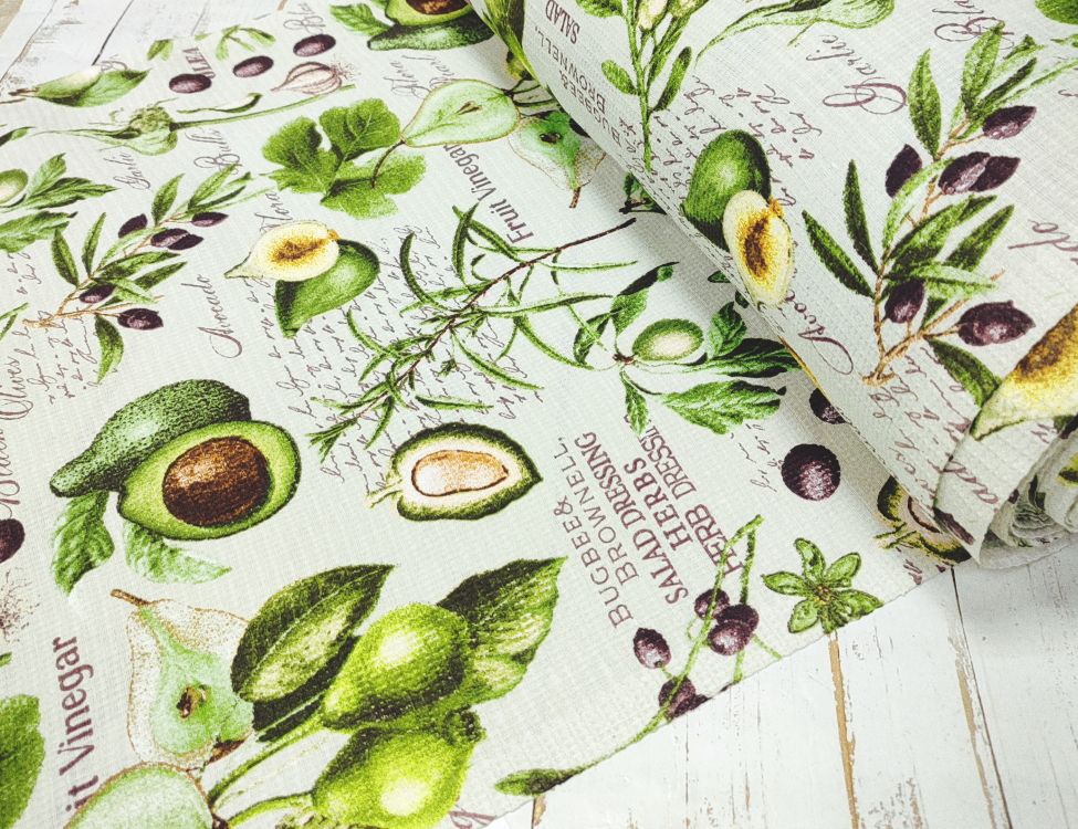 Вафельное полотно 176 г/м2 цвет салатовый принт Авокадо и оливки